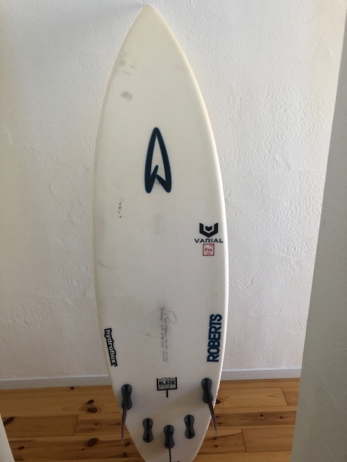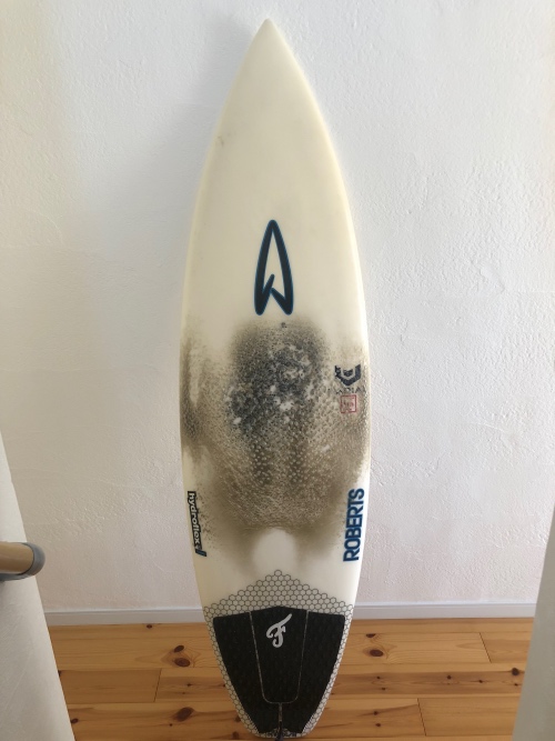 カリフォルニアのロバート・ウェイナー氏にオーダーで作ってもらったもので、腹〜頭ぐらいまでの波の時に使っています。私が持っているボードの中では、最もCL値が低いボードです。素材はなんとVarialです。水を吸わない最新素材です。丈夫でストリンガーが必要ないので、フレックスが均一になります。こちらのボードレビューは今度記事にしようと思います。